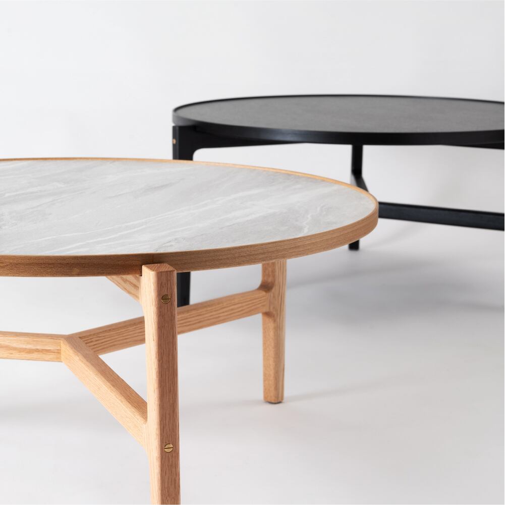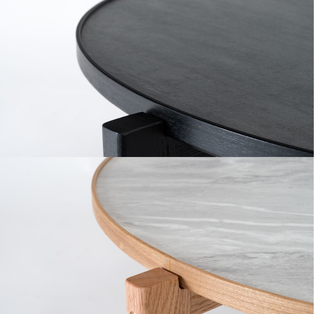 石目調の天板×天然木の組み合わせがナチュラルな雰囲気を与えてくれるラウンドテーブル。
