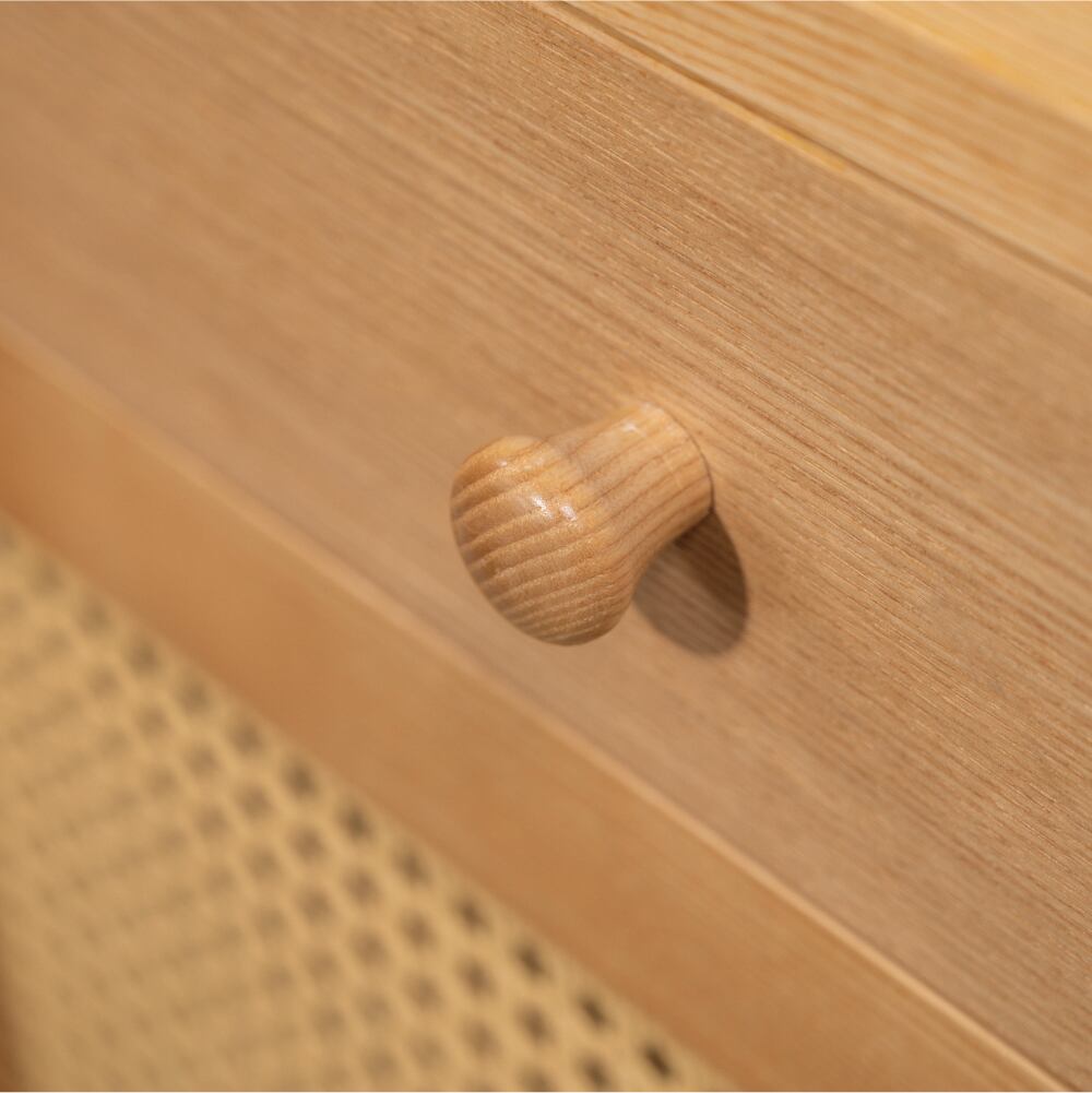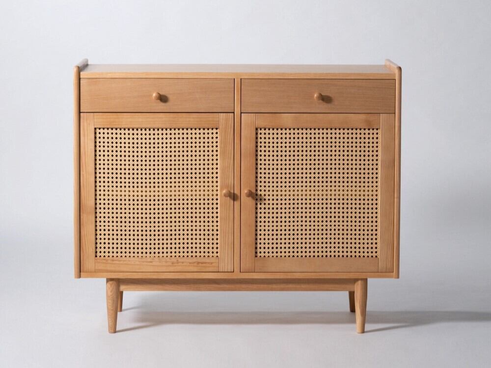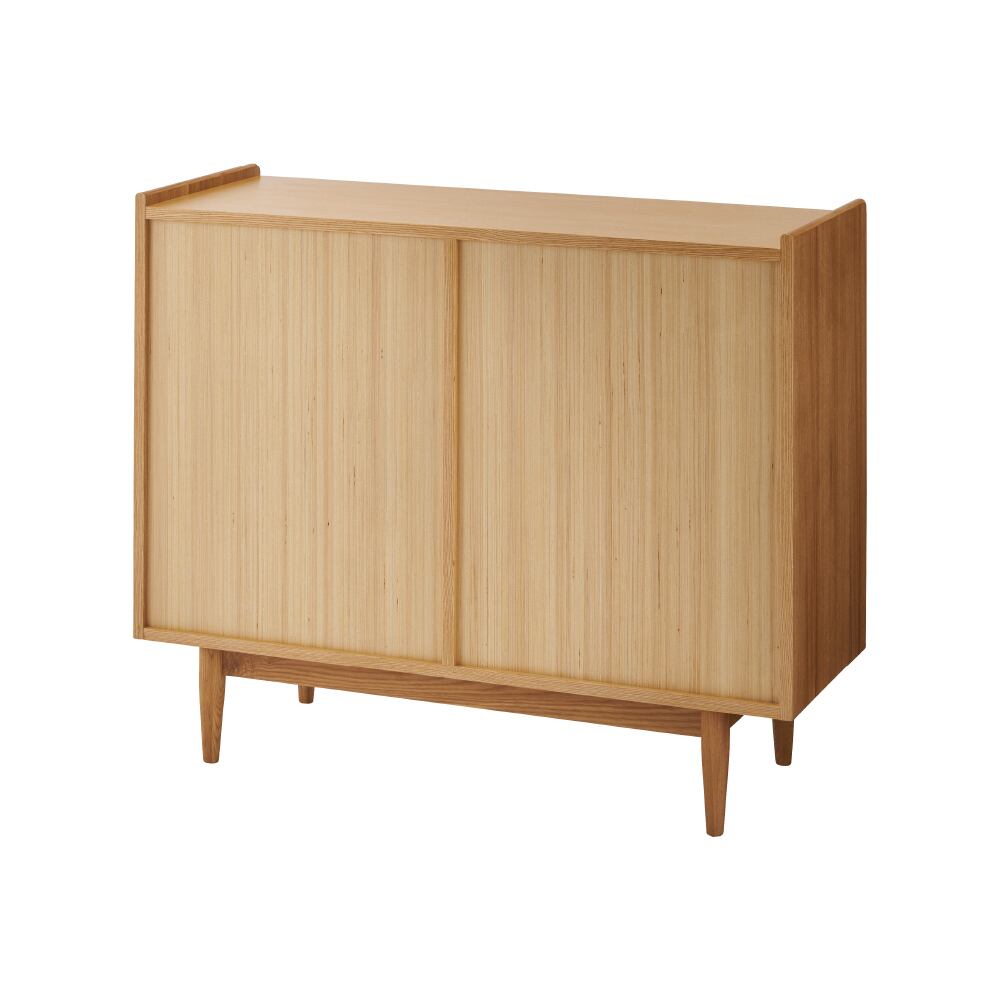 扉いっぱいに広がる編み目のデザインが軽やかさを与え、細身の脚が全体をすっと浮かせ、家具でありながら圧迫感を感じさせない。
