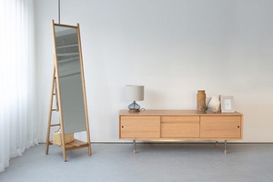 すっきりとしたデザインながら、収納力に優れた自立式ミラー。