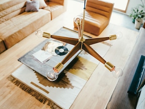 放射状に伸びた滑らかな質感のウッドアームに上品なヘアラインゴールドをあしらったペンダントライト。