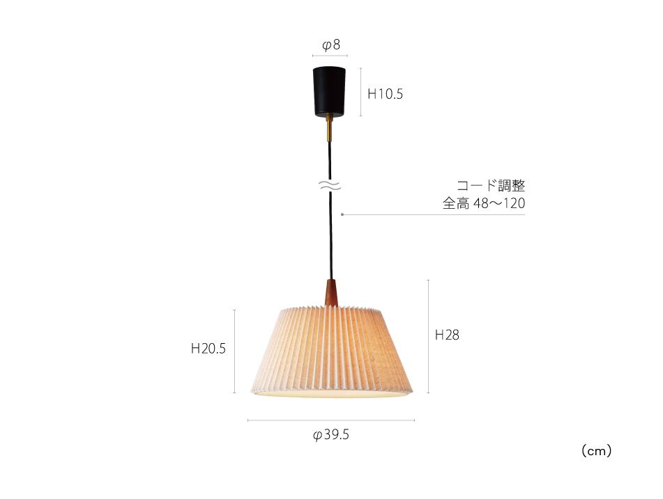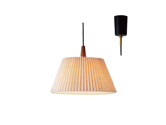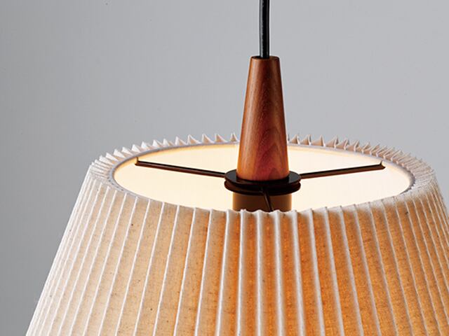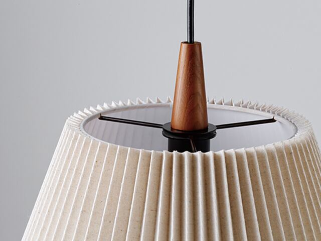 プリーツ状のファブリックセードが柔らかな明かりを灯す、ナチュラルな印象のペンダントライト。