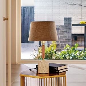 綿麻のシェードやオーク無垢材のポール、ベースには無数の細孔が特徴的な大理石トラバーチンを使用と、各パーツに自然の素材を贅沢に使用し丁寧に仕上げ、更にアクセントとして金属部分にはシャンパンゴールドをあしらうことで製品としての完成度を一層高めています。